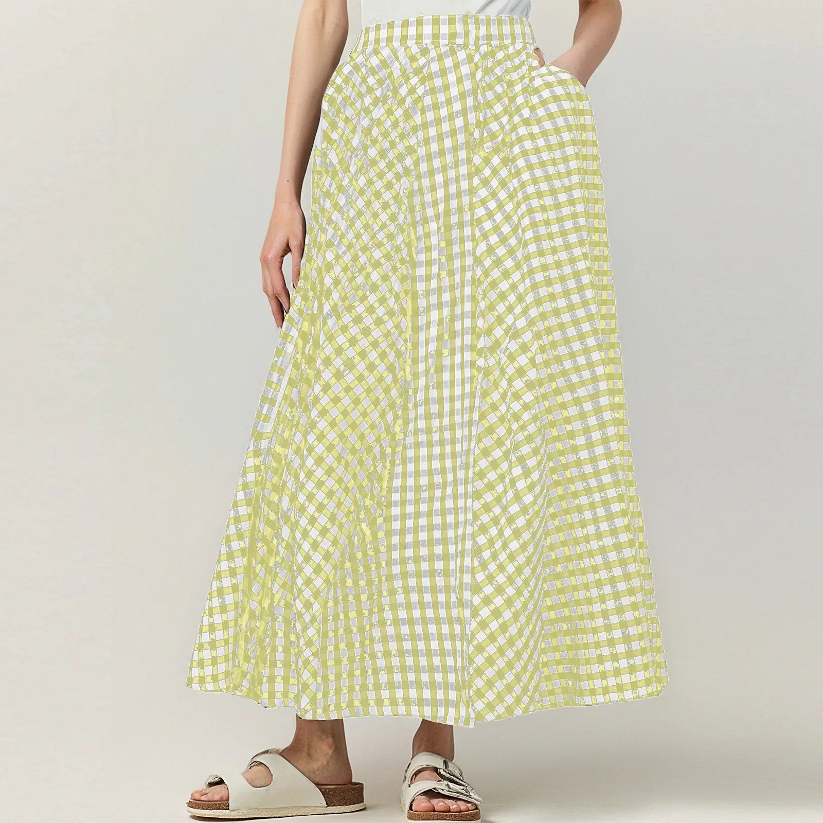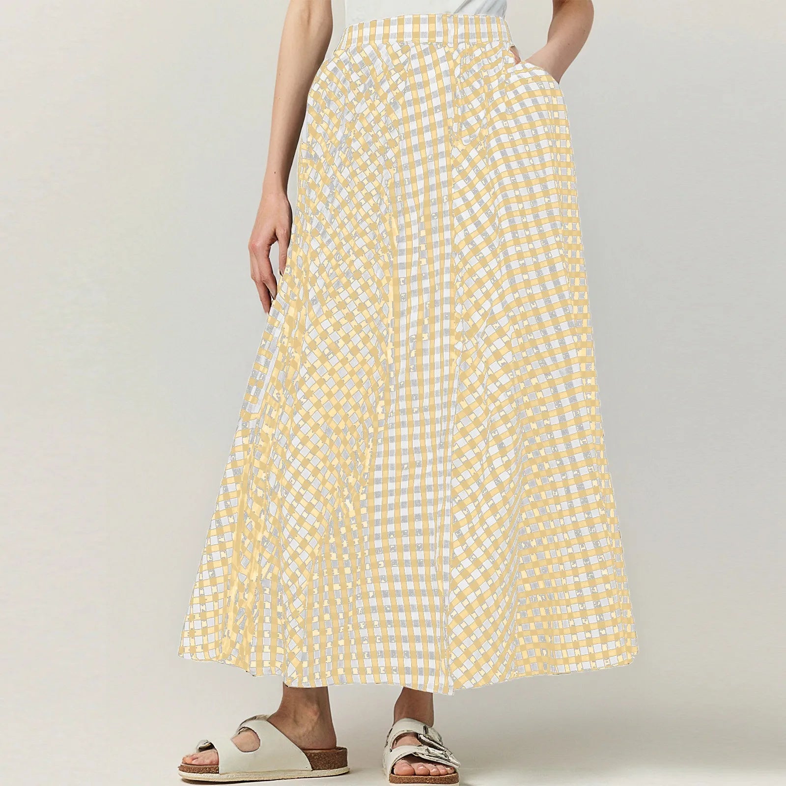 Elevate your warm-weather style with this plaid swing skirt featuring a flattering draped silhouette.